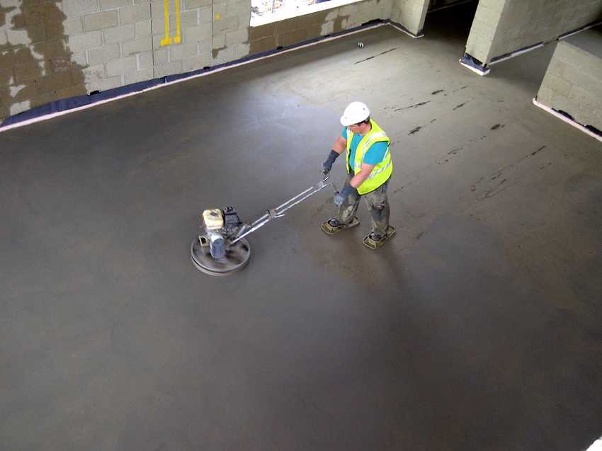 - пропитанный влагой из свежего бетона порошок втирается в стяжку затирочной машинкой до тех пор, пока на поверхности не останется сухого вещества;