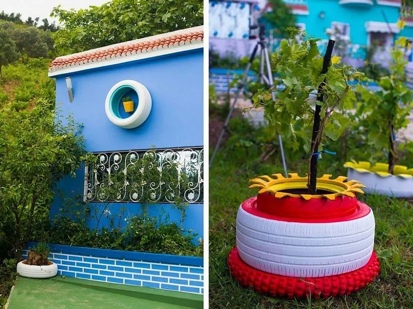 Для украшения дорожек и зонирования пространства используют бордюры. Клумбы из покрышек кладут плашмя на землю или закапывают в грунт по периметру. Мобильные варианты с однолетниками можно перемещать в любое место. Резину очищают от грязи, снаружи покрывают специальной краской.