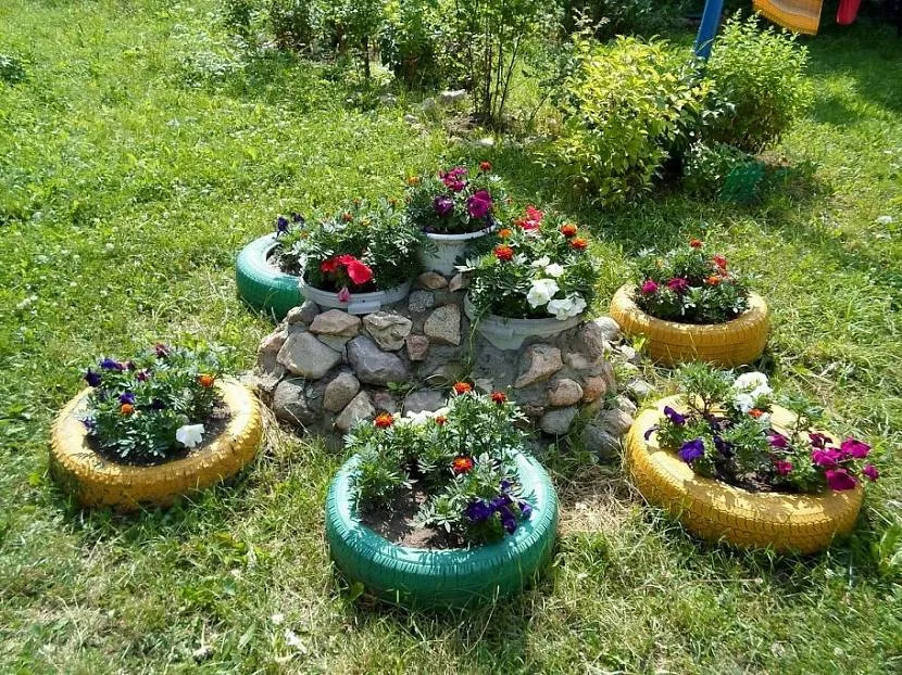 Клумбы из покрышек используют не только для высадки небольших деревьев или кустов, но и довольно часто шины применяются для создания цветников. Условно такие цветники из автомобильной резины можно разделить на два вида: