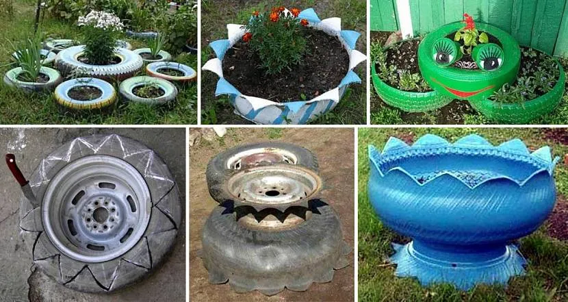 Часто можно увидеть клумбы в виде чайного сервиза или отдельно стоящей кружки. Для их создания достаточно одной автомобильной шины с диском. Верхняя часть покрышки отрезается по всей ширине, нижняя часть — по диаметру диска с небольшим отступом. Обе полученные детали выворачиваются наизнанку.