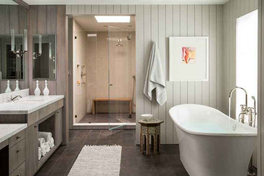 Стильная ванная комната в частном доме оформлена с помощью пластиковых панелей