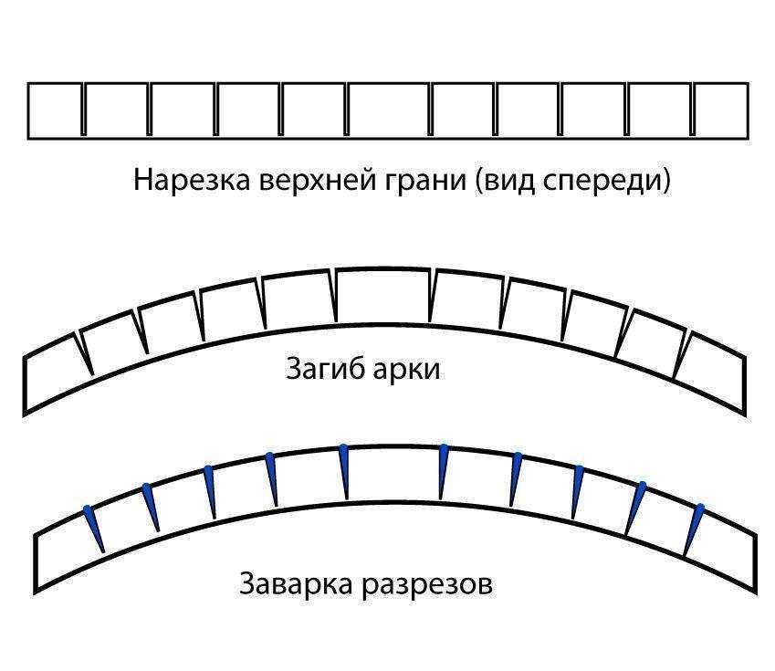 - Сначала нужно сделать надрезы болгаркой на верхней грани трубы с шагом 10–15 см (зависит от радиуса планируемой арки).