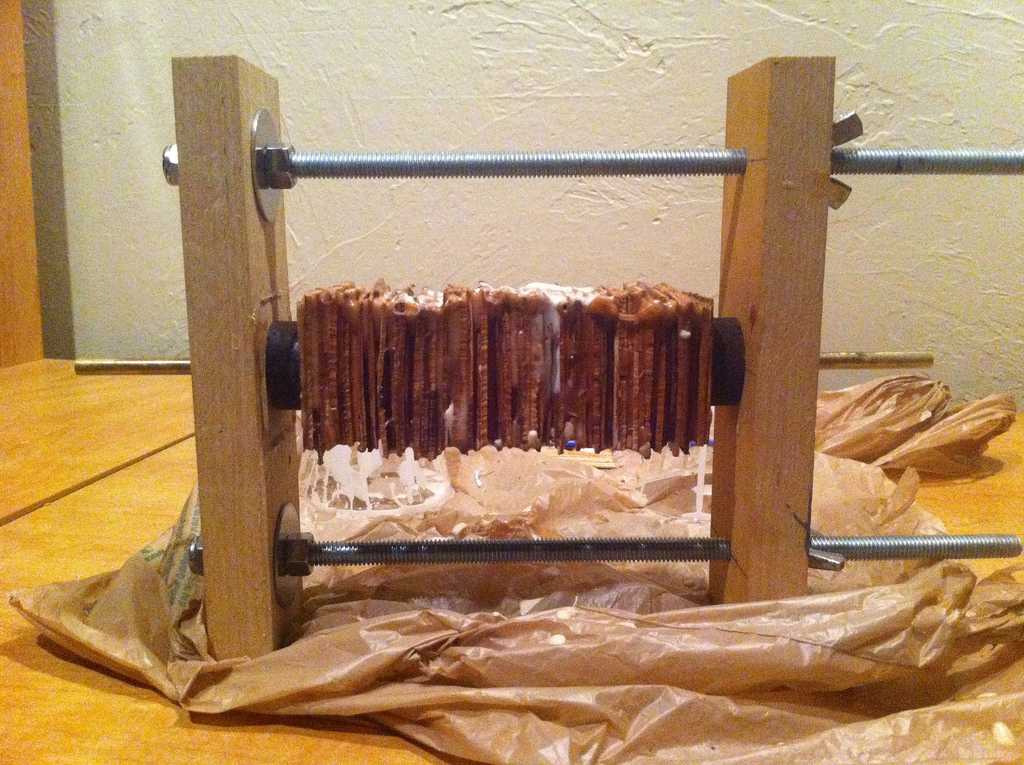 - Полуготовое изделие вставить в тиски или пресс, прождать до полного высыхания (сутки-двое).