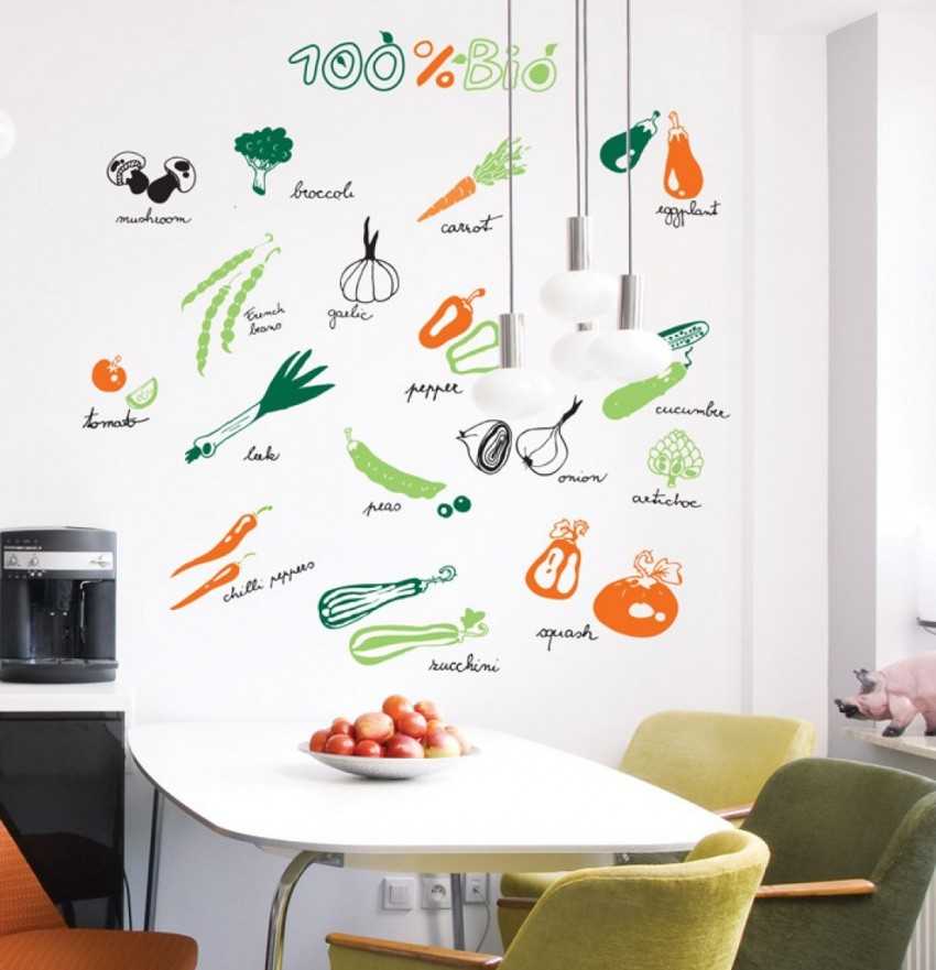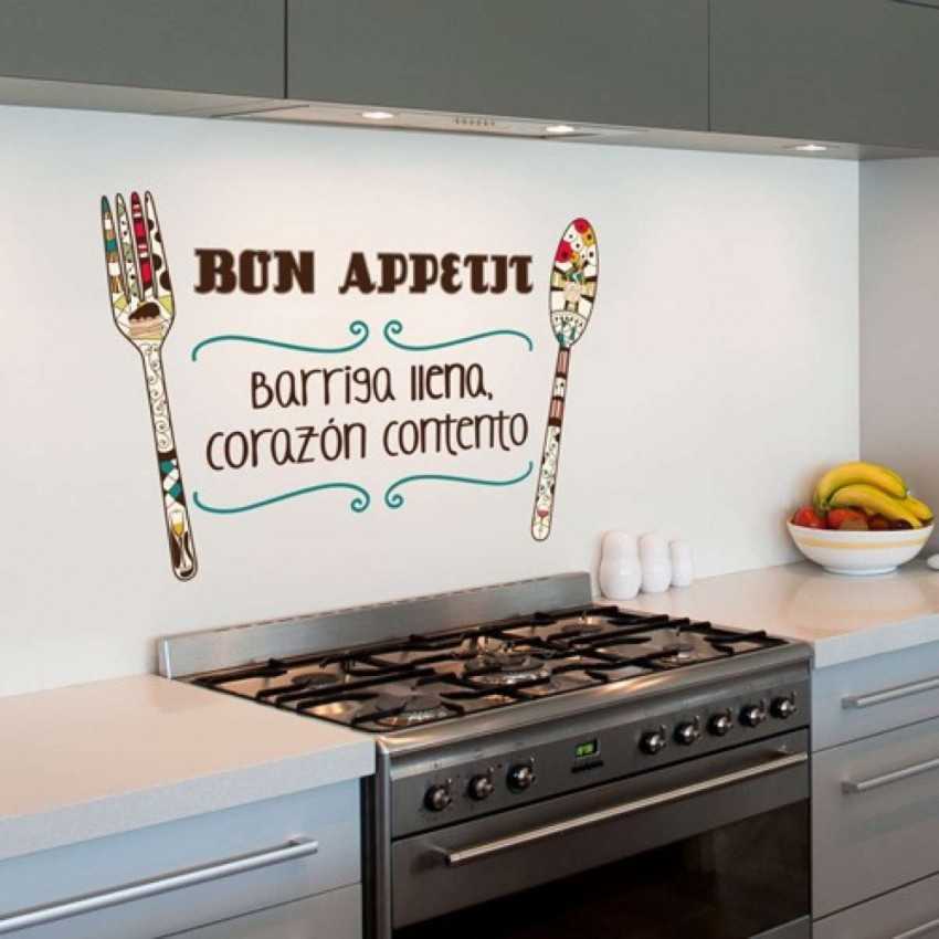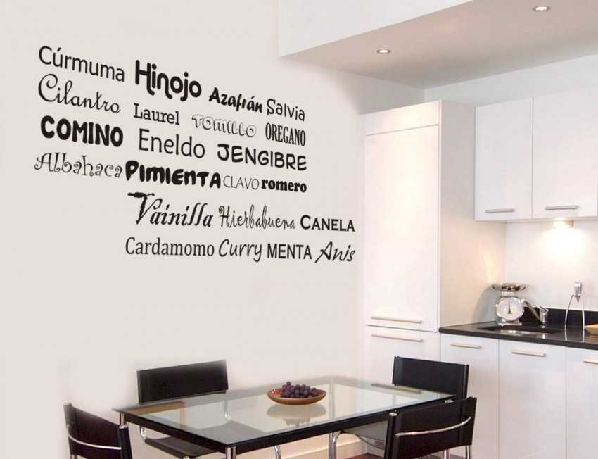 На кухне уместны надписи, задающие хорошее настроение и настраивающие на прием пищи. Отлично будут выглядеть пожелания приятного аппетита, названия любимых блюд, овощей, фруктов, напитков.