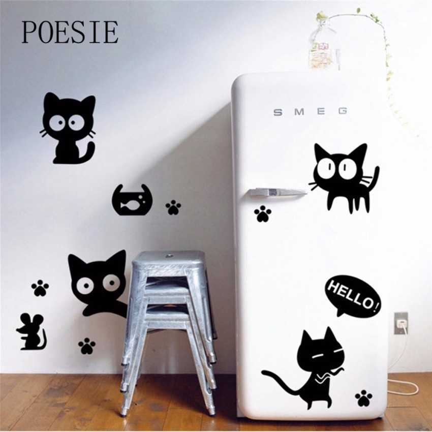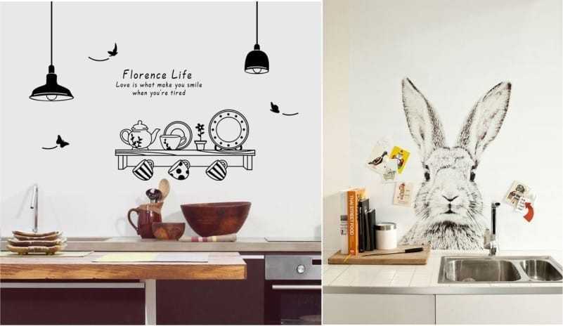 В кухне хорошо смотрятся наклейки на холодильнике или на фасадах кухонных шкафов. Тут уже можно использовать маленькие изображения. Бабочки, цветы, те же кошки оживят интерьер и сделают его интересным. Если же есть свободная стена, то можно снова использовать большие наклейки — например, изображения пары чашечек с кофе в зоне около стола.