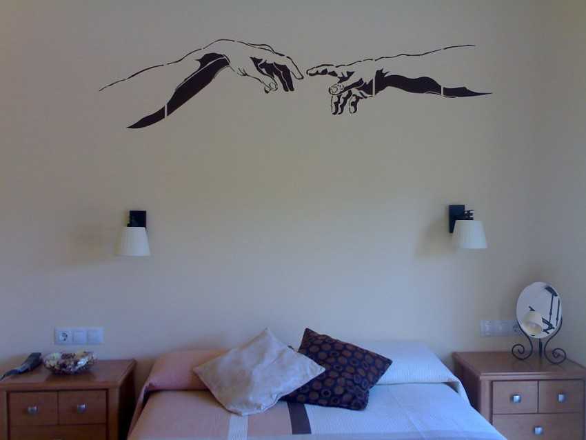 В спальне будут хорошо смотреться спокойные рисунки с животными, растениями. Также здесь можно разместить цветок лотоса или какой-нибудь этнический узор. При желании можно разместить похожие по тематике рисунки на стене над кроватью и, например, на зеркальных дверцах шкафа-купе.