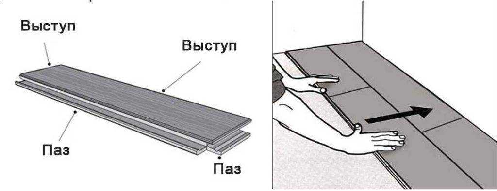 Плитка с замком кладется от стены. Плитки располагают так, чтобы пазы смотрели в помещение. Первую полосу располагают на расстоянии в несколько мм от стены. Этот зазор нужен на случай, если плитки расширятся при нагревании. Стыковку обычно проводят, начиная с короткой стороны, а затем вводят в пазы длинную сторону.