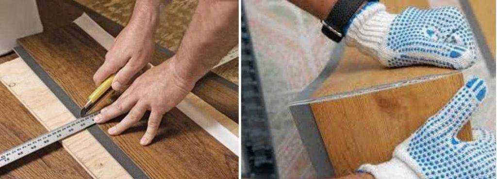 - Укладка к стене. Подрезать кварцвиниловую плитку с лицевой стороны и разломать. Рекомендуемый зазор между кладкой и стеной — 5-7 мм.