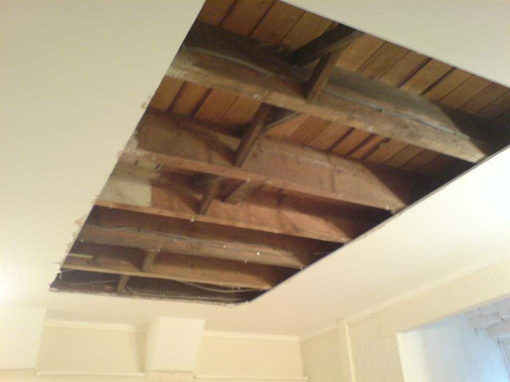Сначала необходимо подготовить потолочное перекрытие – его нужно очистить, удалив все оставшееся от прежней отделки. В случае необходимости поверх перекрытия укладывается слой гидроизоляции – дерево чувствительно к повышенной влажности. Если перекрытие деревянное, его следует обработать огнезащитным составом.