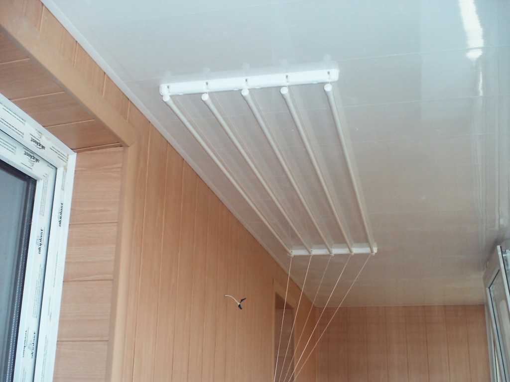 Внешне и в плане технических характеристик сушилки данного типа почти не отличаются от настенных, однако крепятся они не к стене, а к потолку, тем самым экономя место на балконе. Они могут иметь разную длину, также во время установки следите за положением рейки, если она будет находиться слишком низко, то белье может испачкаться.