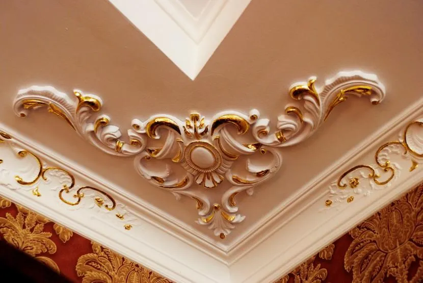 - Лепнина может стать основным акцентом интерьера, для этого карниз или молдинг делают не только крупным, но и контрастным. Чтобы добиться нужного эффекта, лепнину красят или тонируют, покрывают художественной росписью, позолотой или патиной.