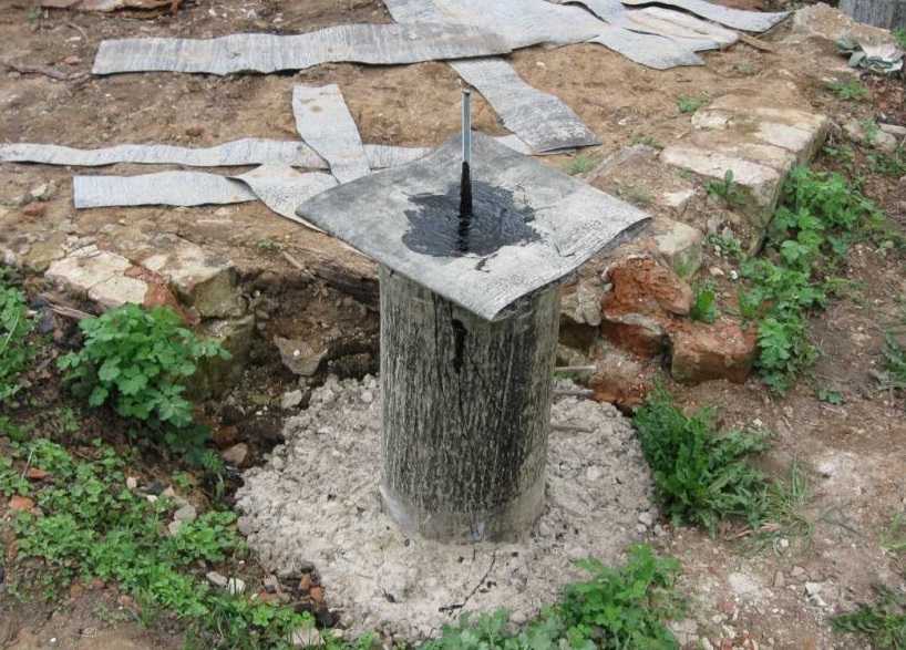 Садовым буром в грунте делается яма, на дно которой насыпается 30 см песка. Поверхность подушки необходимо уплотнить, тщательно смочив песчаную прослойку обычной водой. Далее в полученное отверстие вставляется гильза, изготовленная из рубероида.