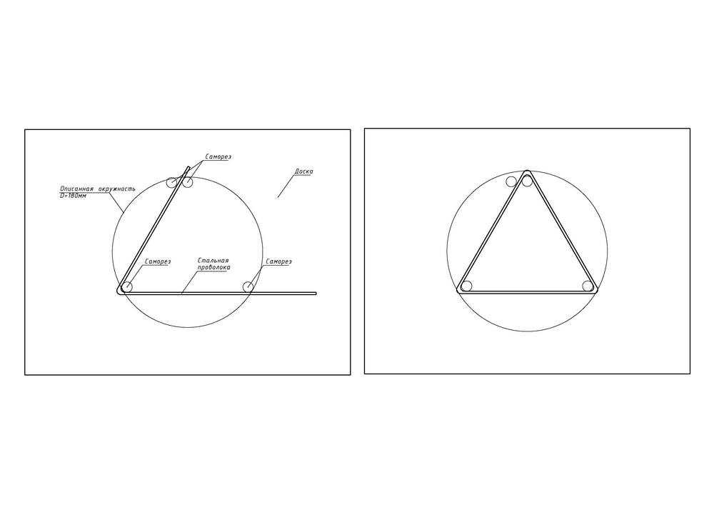 В нарисованный круг нужно вписать треугольник, стороны которого равны. В вершины начерченного треугольника необходимо ввернуть саморезы. Для упора вворачивается еще один саморез рядом с любой вершиной, он потребуется для формования проволоки. Проволока наматывается на ввернутые саморезы, образуя четкие границы треугольника. В явно обозначенных вершинах геометрической фигуры устанавливается арматура.