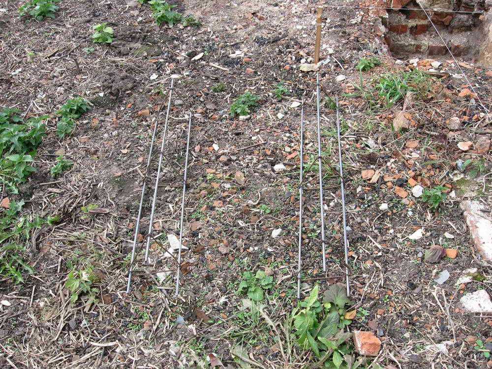 - В места установки столбов вбивают колышки или отрезки арматуры.