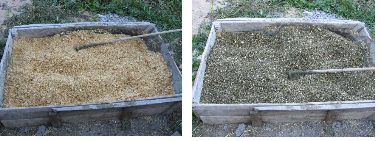 Это наиболее трудоемкий вид работ, при этом основная масса времени и сил уходит именно на приготовление опилочно-глиняной массы. Перемешать глину и опилки в миксере довольно сложно, поэтому приходится использовать металлическое корыто и штыковую лопату.