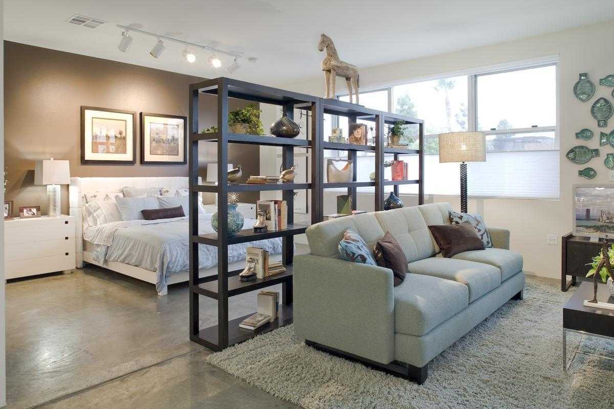 Зонирование пространства. Помещение можно разделить при помощи раздвижных дверей, перегородок, строительных конструкций, текстиля, свисающих с потолка фото, различных отделочных материалов и даже при помощи цвета.