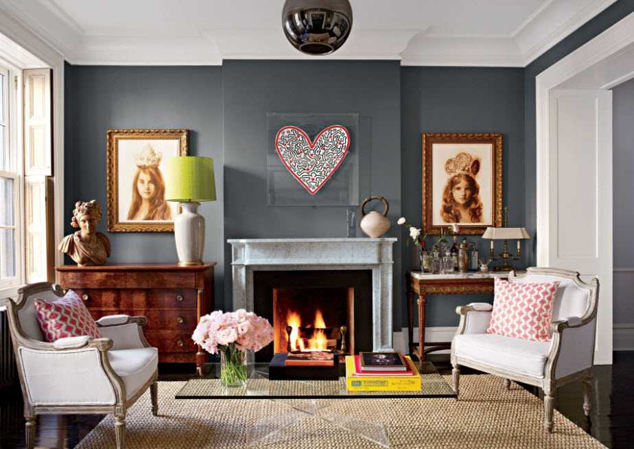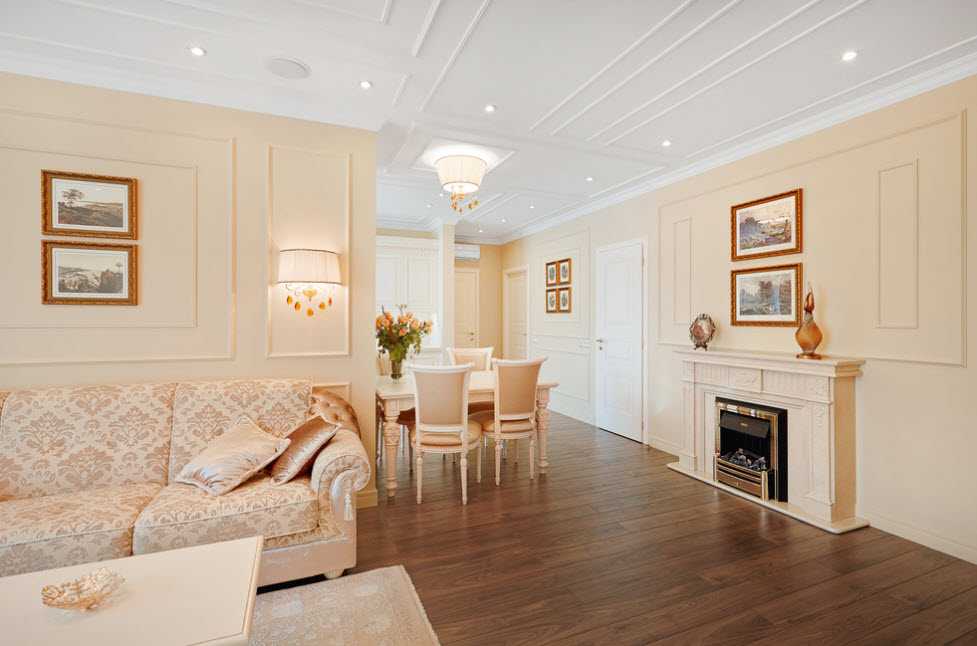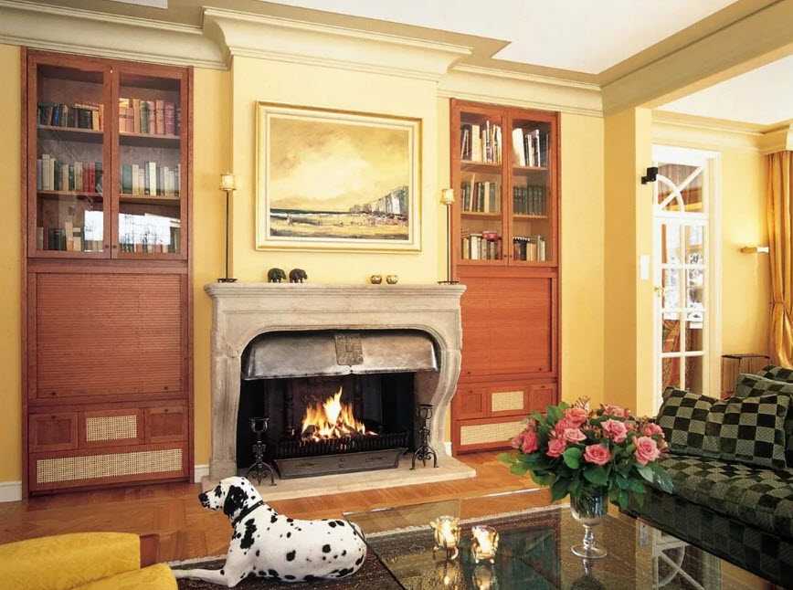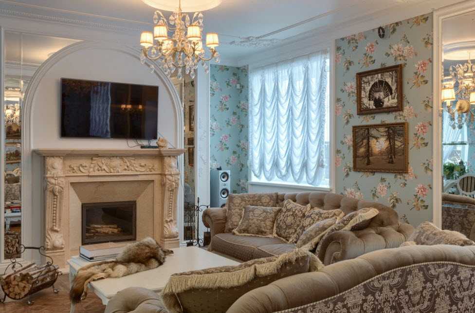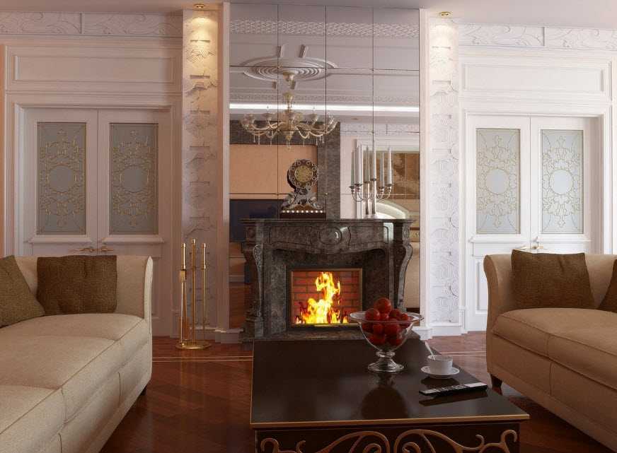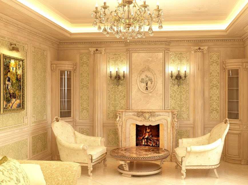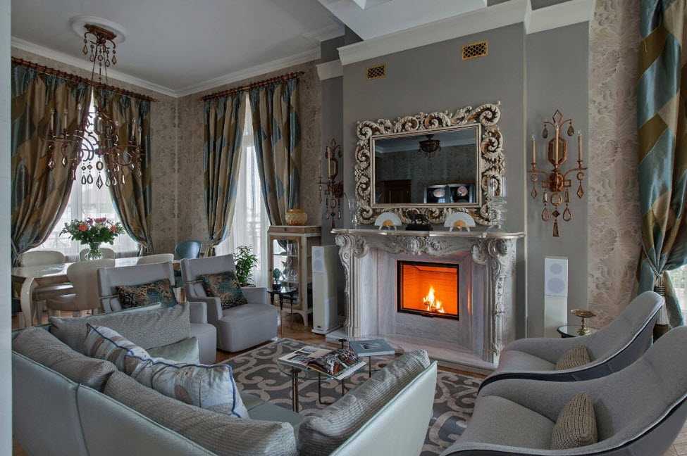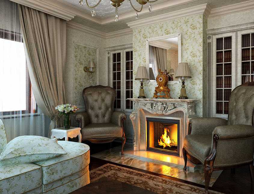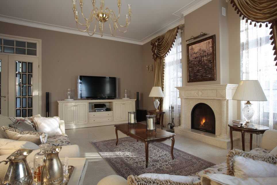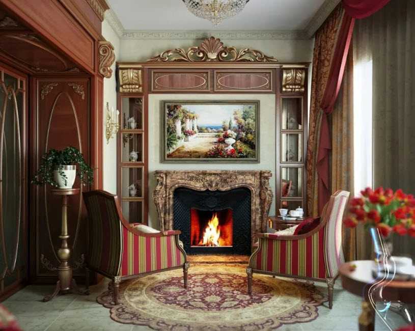 Гостиная в классическом стиле. Печь можно оформить, используя для ее отделки мрамор, натуральный или искусственный камень. Также отделку печи можно провести с помощью плитки и изразцы.