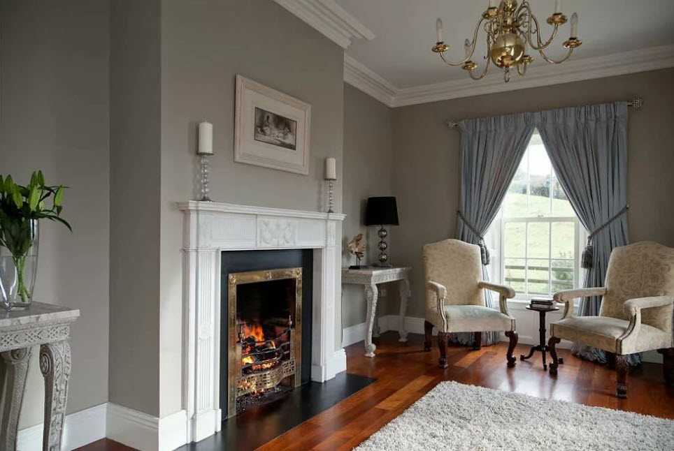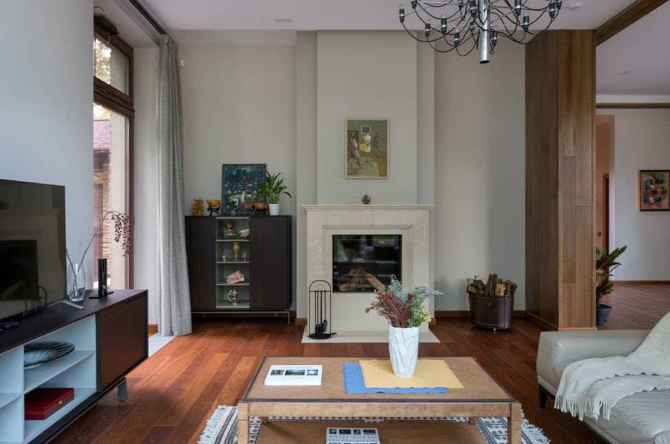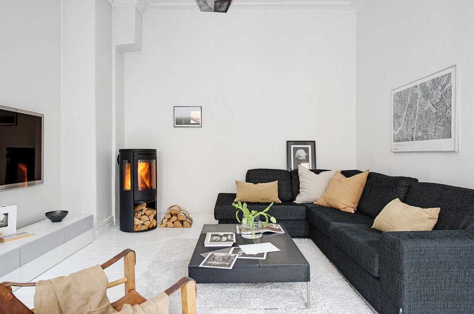Сочетание уюта, тепла и комфорта в гостиной загородного дома — чугунный камин.