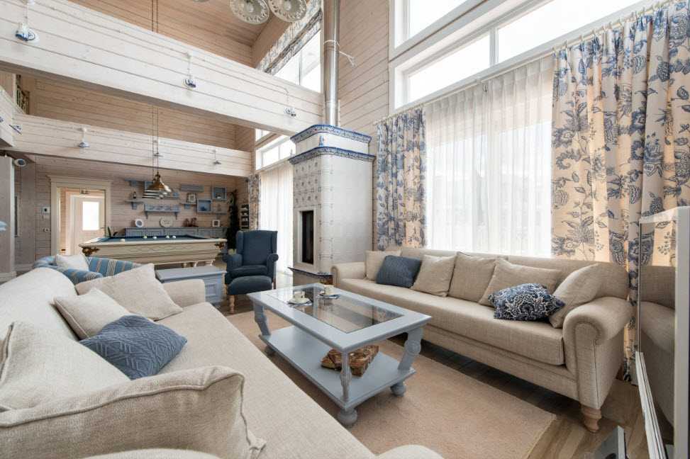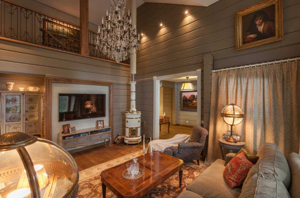 Интерьер выдержан в древесных, песочных и бежевых оттенках: они символизируют спокойствие и чистоту. Русская печь — сердце этого дома, она напоминает традиционную печку из народных сказок, которая всегда накормит, обогреет и даже даст совет. Она дарит атмосферу уюта и притягивает взгляд.
