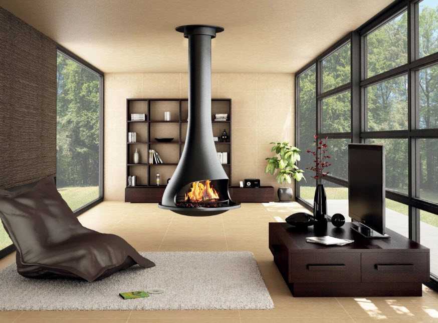 Современный камин с дымоходом и створками из огнеупорного стекла. Красивый дизайн, и необыкновенный цвет-терриконовый делает камин украшением интерьера гостиной.