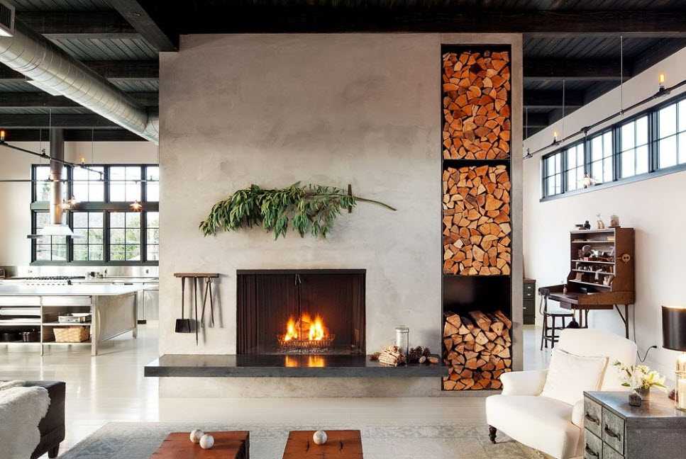 Лофт – внешнюю отделку камина можно выполнить при помощи труб с налетом ржавчины и слоем сажи, служащими художественным элементом промышленного дизайна. Дымоход здесь не прячут, а намеренно выставляют напоказ.