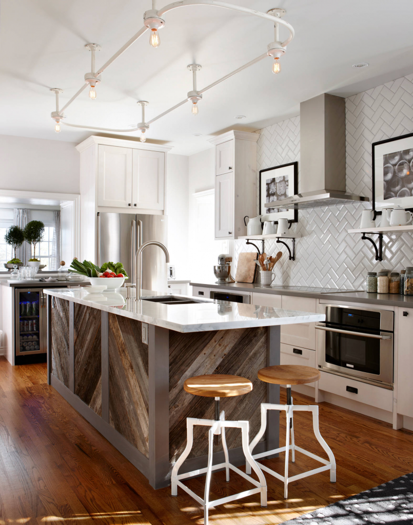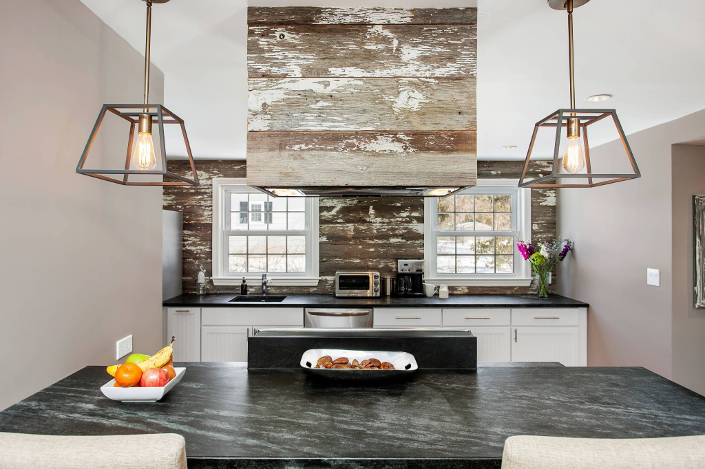 Кухня — фасады шкафчиков, обеденный стол, стулья, столешница могут быть выполнены из старых досок, создавая эффектный контраст с современной техникой из стекла и полированного металла. Такая кухня станет гораздо уютней, на ней приятно будет проводить семейные вечера или принимать гостей.