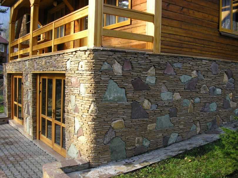- Фундамент дома декорирован натуральным или искусственным камнем.