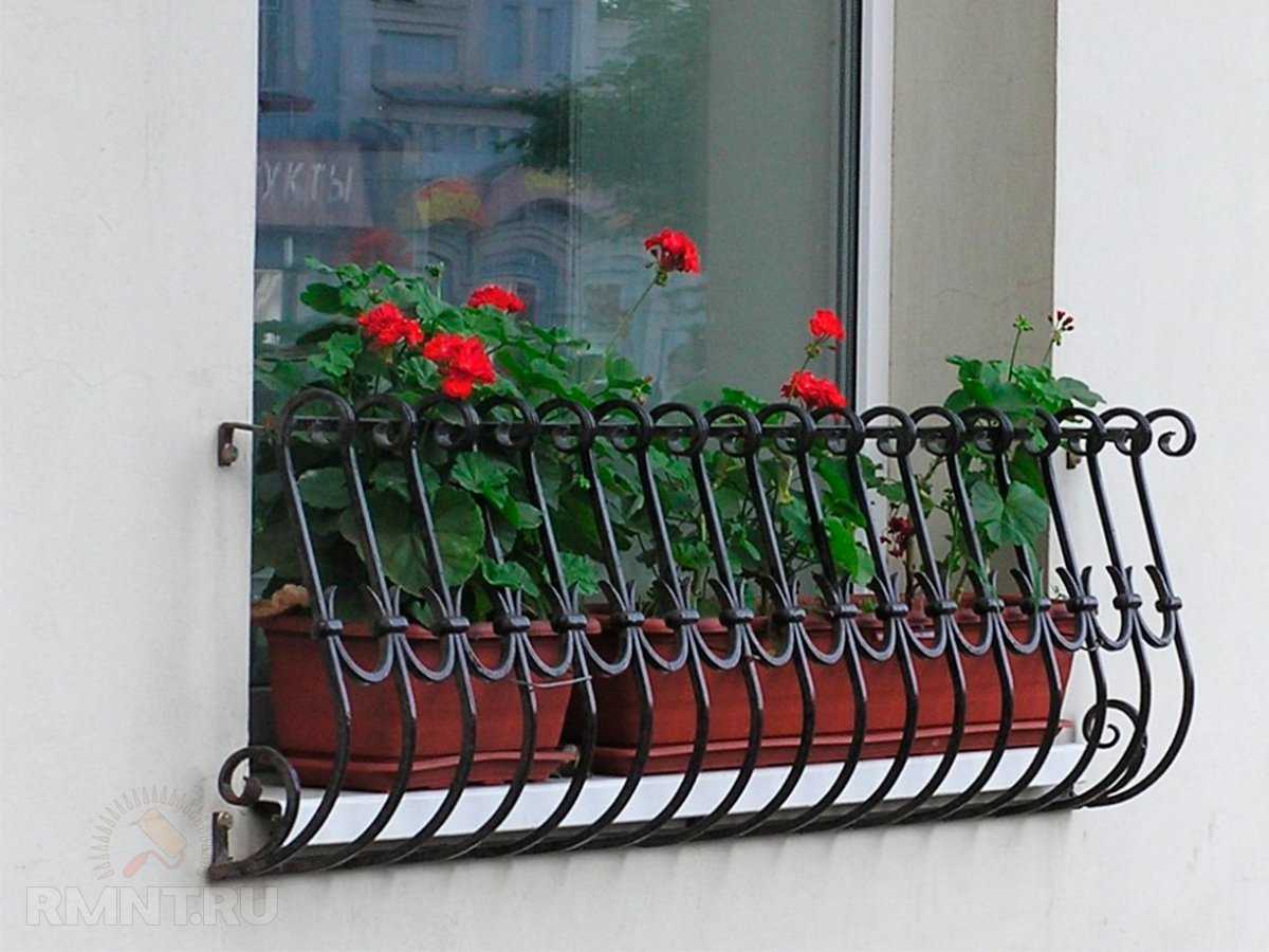 - Решётки для всего окна, выпуклые внизу или отступающие от стекла, в это пространство можно установить контейнер с цветами. Получается два в одном — и защита от грабителей, и украшение фасада.