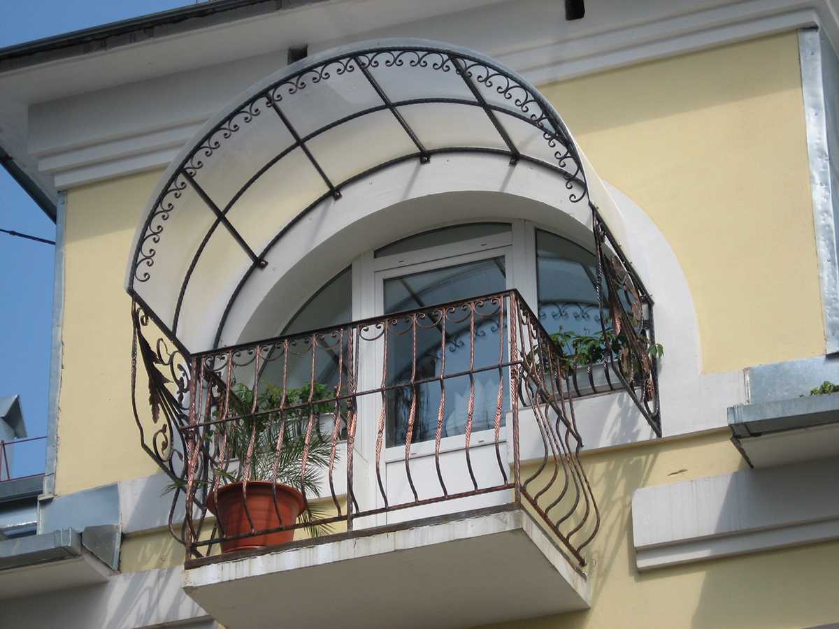 Самыми популярными сегодня являются кованые конструкции. Действительно, они выглядят необычайно привлекательно, особенно в комплекте с таким же навесом. Металлическая конструкция не боится ветра и ливня, не растрескается от мороза. Кованые цветочные корзины крепят к стене под рамой на прочные анкерные крепежи.