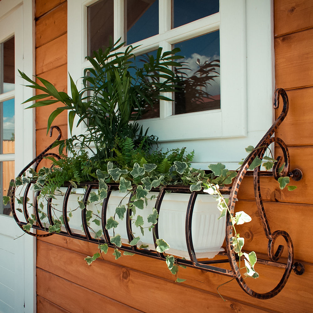 Самое простое, что вы можете сделать — это купить готовые цветочницы. Они бывают из пластика, дерева, металла. Особенно привлекательно выглядят кованные декоративные цветочницы на окна или балкон.