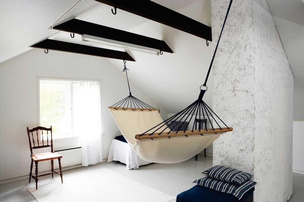 Собственноручное изготовление и установка гамака ─ предмет творческого полета фантазии. Возможно приобрести готовую конструкцию, однако собственная модель выглядит оригинальнее, ткань полотнища подбирается согласно задуманного интерьера.
