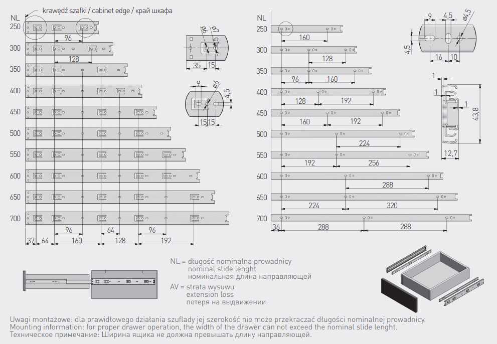 шариковые (телескопические) направляющие для выдвижных ящиков