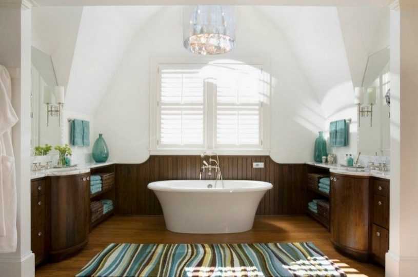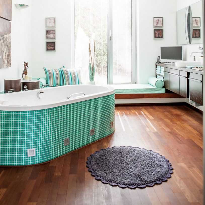 - для просторных ванных с кривыми, угловатыми линиями можно смело выбирать круглое покрытие. Оно поможет сгладить острые углы, добавит уюта и мягкости окружающей обстановке;
