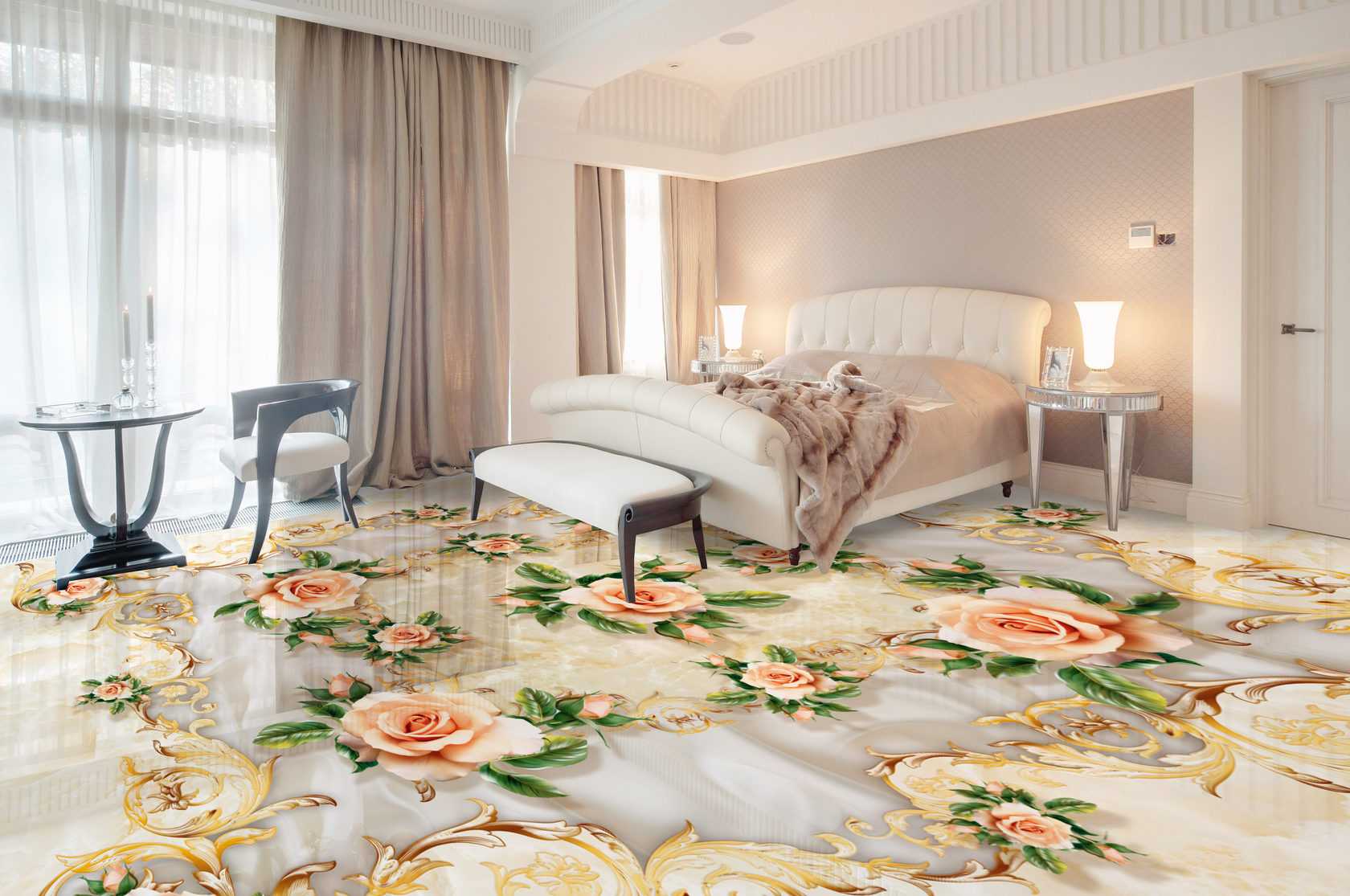 На напольное покрытие можно будет установить любые виды изображений, которые сверху покроет бесцветная жидкость, и быстро застынет, придав износоустойчивость слою.
