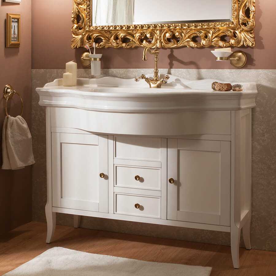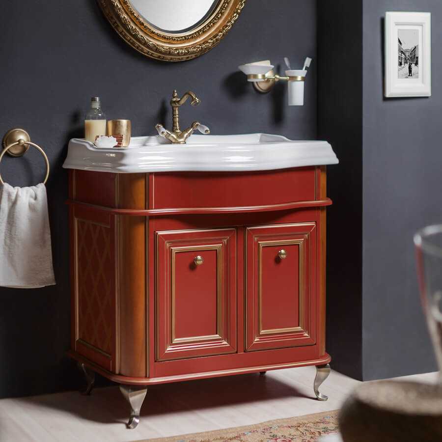 При исполнении ванной комнаты в стиле классицизма, которому присущи специфические облицовочные материалы с оттенками серебра и золота, а также элементами резьбы установка тумбы из нержавеющей стали или керамики не будет сочетаться с роскошью и богатством общего ремонта.