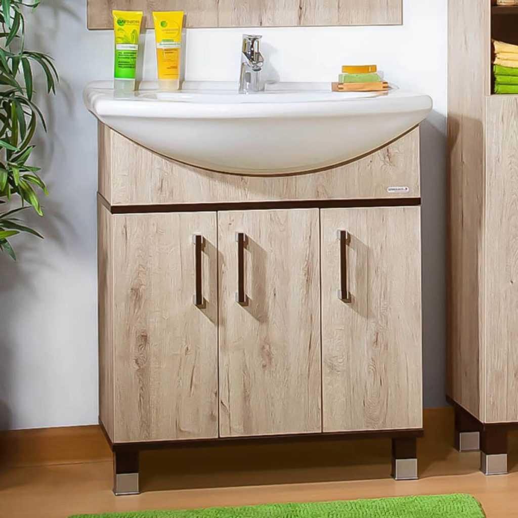 Лучше выбирать раковину с тумбочкой на ножках. Она не будет греться от напольной поверхности, позволит проводить уборку под ней и качественно проветриваться, что достаточно важно для помещений, где высокий уровень влаги.