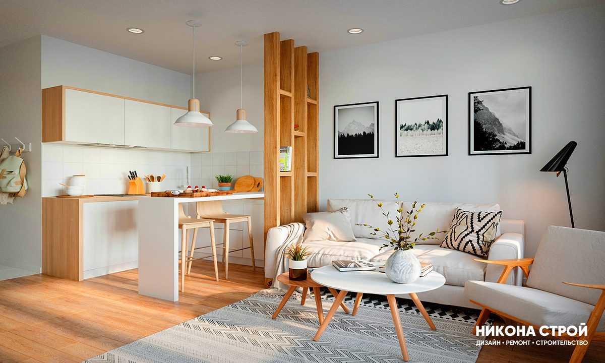 Традиционно обустройство квартиры-студии предполагает небольшое разделение кухни от остальной части жилого пространства.