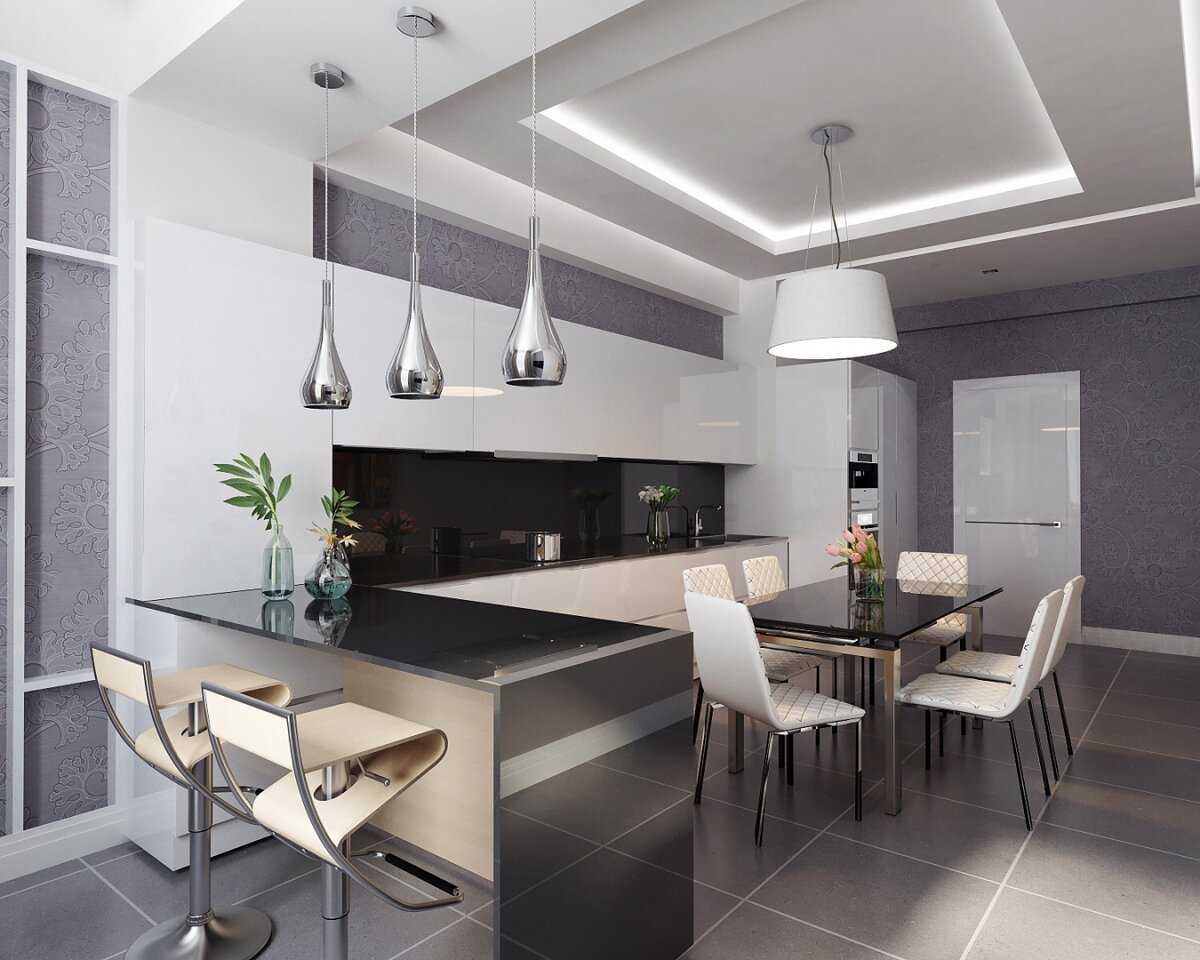 Модерн. Стиль для тех, кому нравятся роскошные интерьеры экстра-класса. Для создания в кухне-столовой нужной обстановки понадобится изысканная мебель и дорогие отделочные материалы.