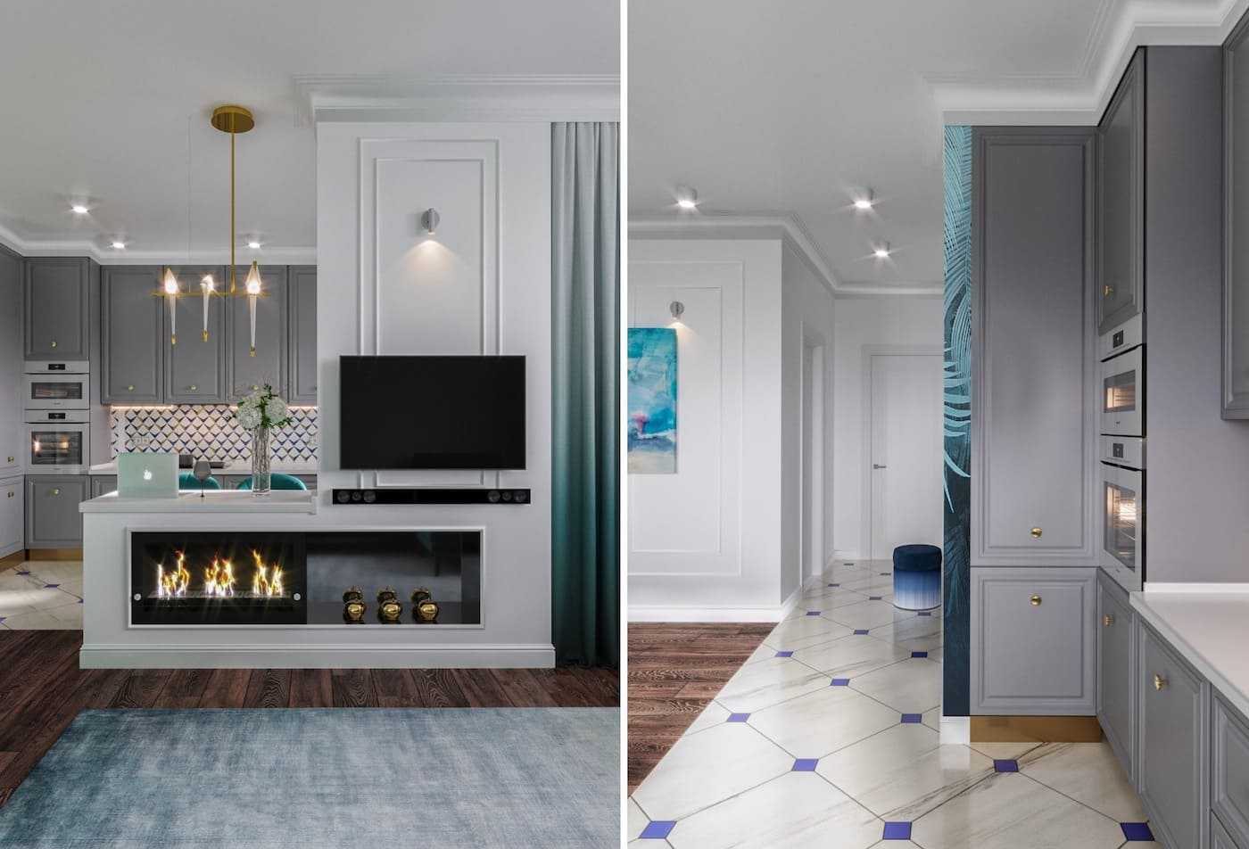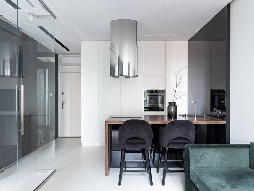 В прихожей располагаются основные места для хранения вещей. Это ряд встроенных шкафов, которые выполнены в белом цвете, такой оттенок делает их менее громоздкими и заметными. Далее сразу начинается зона кухни. Одна из стен, где располагается столовая зона, полностью зеркальная. Отделка зеркалами — это основной прием для увеличения объема пространства
