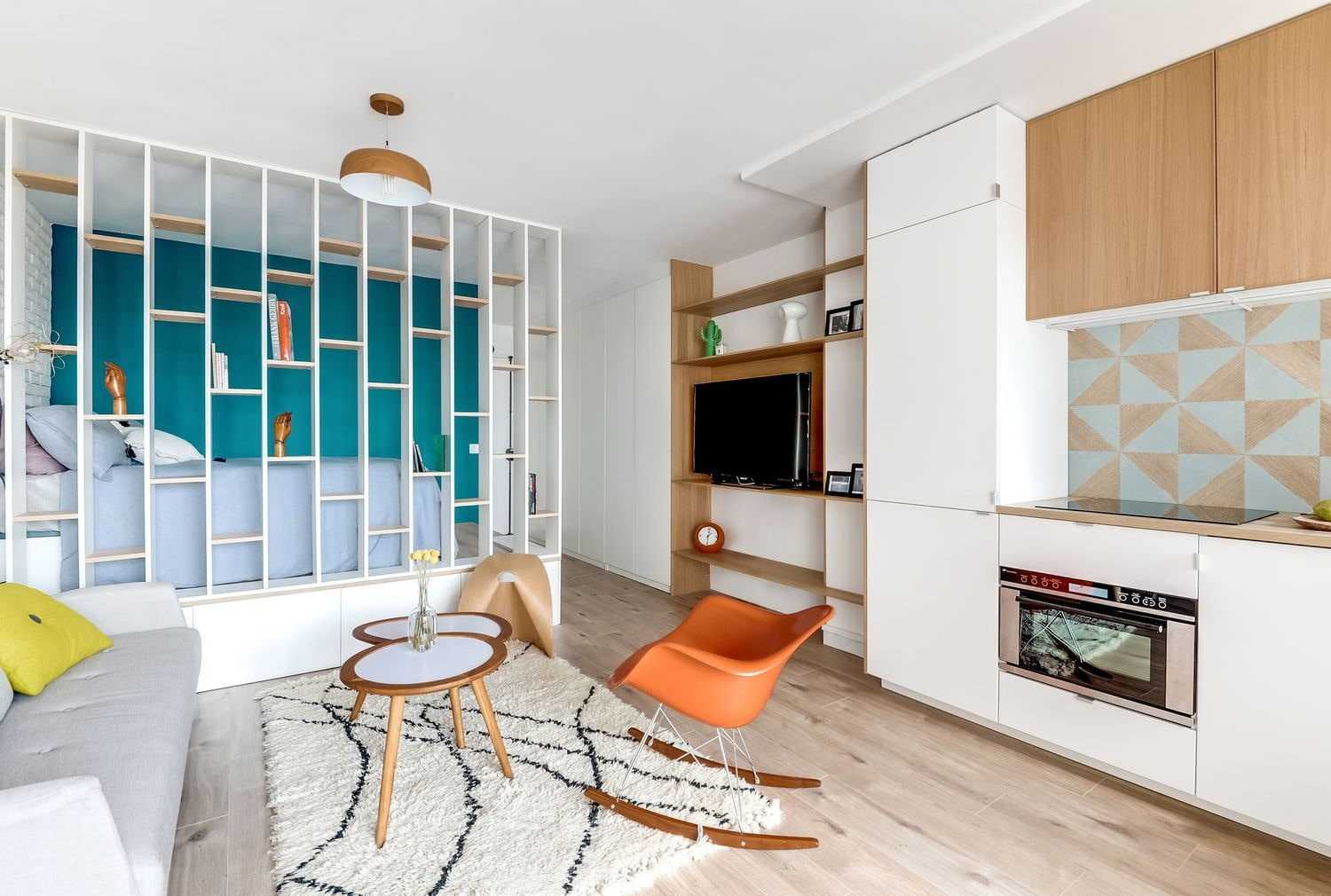 В целом, для квартиры студии в 26 квадратных метров старайтесь использовать меньше мебели. Желательно, чтобы она выполняла сразу несколько функций (например, зонирование пространства и хранение вещей). Также будьте внимательны с деталями: журнальный столик будет вполне лишним, а полка с массой сувениров и другой мелочью уж тем более.