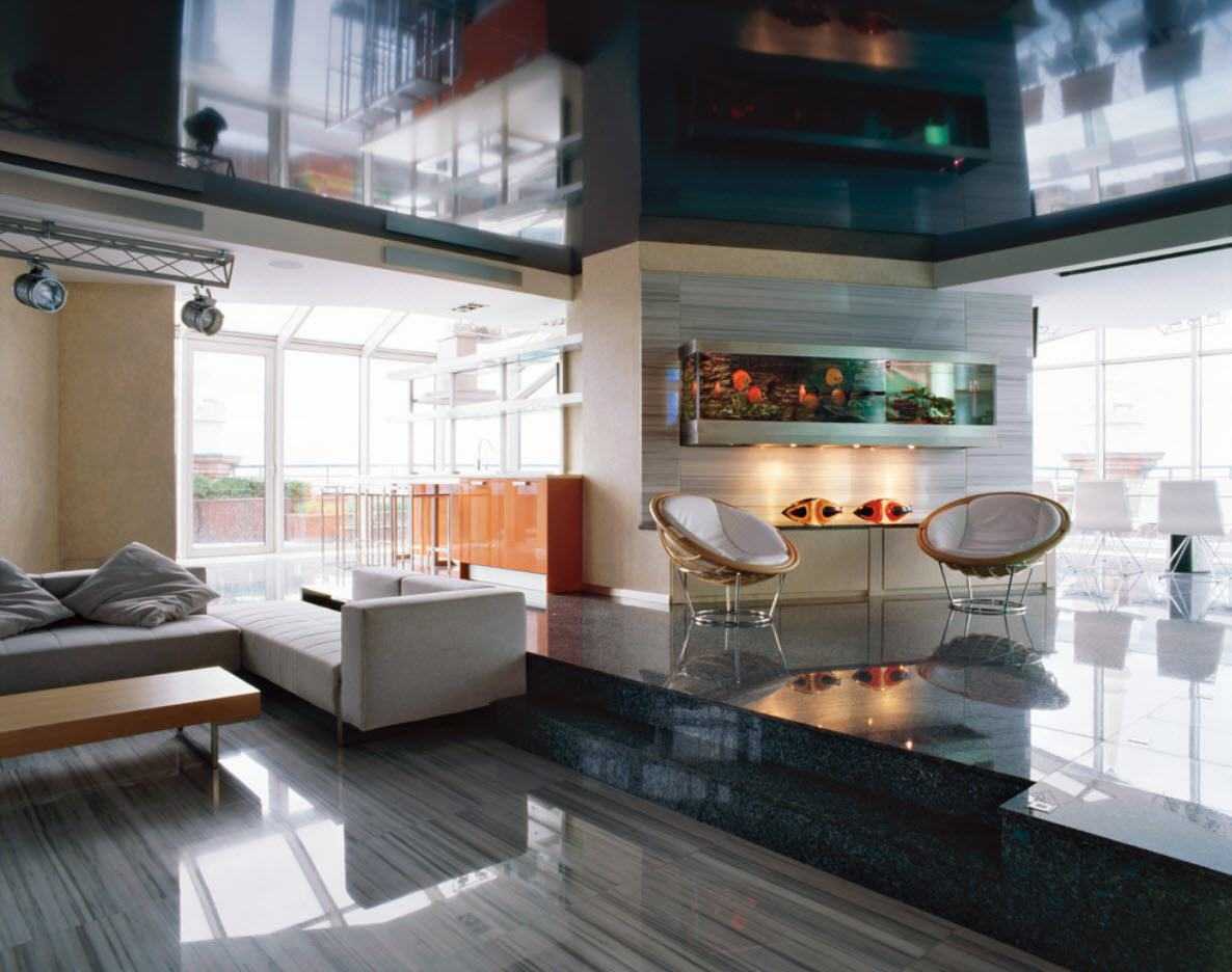 Рассматривая образцы полимерных потолков, многие собственники недвижимости, планирующие косметический ремонт гостиной, останавливают восхищенные взгляды на зеркальном натяжном потолке.
