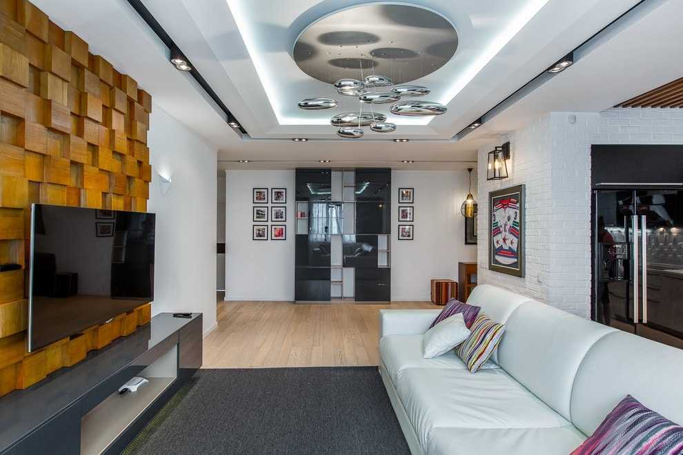 Гостиная или зал дают больше возможностей для воплощения фантазий. Будет уместен потолок сложной формы, панели и вставки из различных материалов, а также объемные изображения. Размер и цвет конструкции стоит выбирать в зависимости от высоты потолков и площади комнаты.