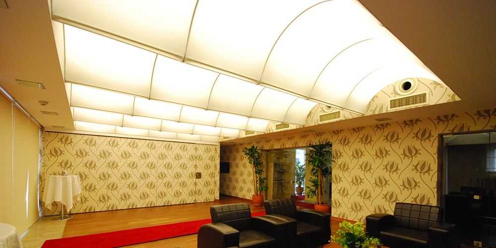 Тканевый натяжной потолок – плюсы и минусы в зале фото