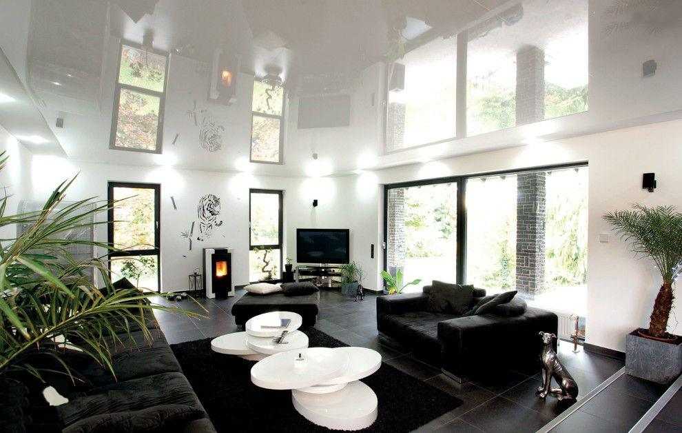 При выборе натяжных потолков необходимо определиться, какой вариант вам нравится больше всего – матовый или глянцевый. Блестящее, практически зеркальное покрытие глянца отлично расширяет пространство. А матовый максимально скрывает швы между полотнами. Но в некоторых случаях маскировать швы совсем необязательно. Это может стать своеобразной изюминкой интерьера. Так, к примеру, сатиновый белый потолок с черными полосами смотрится лаконично и стильно в современном интерьере гостиной.