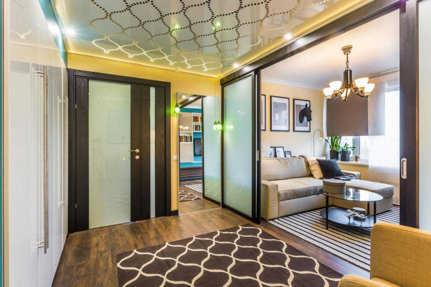Компактный коридор можно зрительно сделать просторнее за счет светоотражающих поверхностей, это может быть глянцевый натяжной потолок, необычные зеркальные вставки или подсветка. Для открытых и светлых прихожих можно использовать яркие цвета и оригинальные многоярусные конструкции.