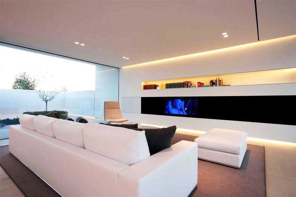 Светящийся потолок. Если вам трудно выбрать освещение в гостиной, то следует задаться вопросом, нужно ли выбирать люстру или галогены? Благодаря использованию прозрачной (полупроницаемой) фольги источником света может быть сам потолок, который будет сиять по всей поверхности. Условие заключается в размещении светодиодов над ним.