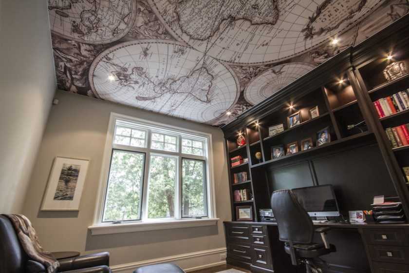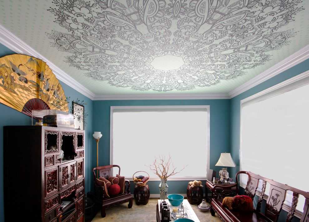 Потолок может служить продолжением общей концепции комнаты или стать неповторимым произведением искусства. На поверхность можно нанести необыкновенный узор, орнамент или даже фотографии.