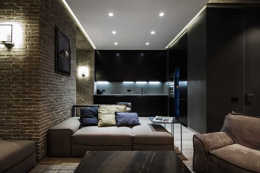 Даже в маленьких, узких помещениях не стоит боятся использовать черный глянцевый потолок. При правильной подсветке он сможет добавить в комнату пространства — просто используйте точечные светильники и избегайте объемных люстр.
