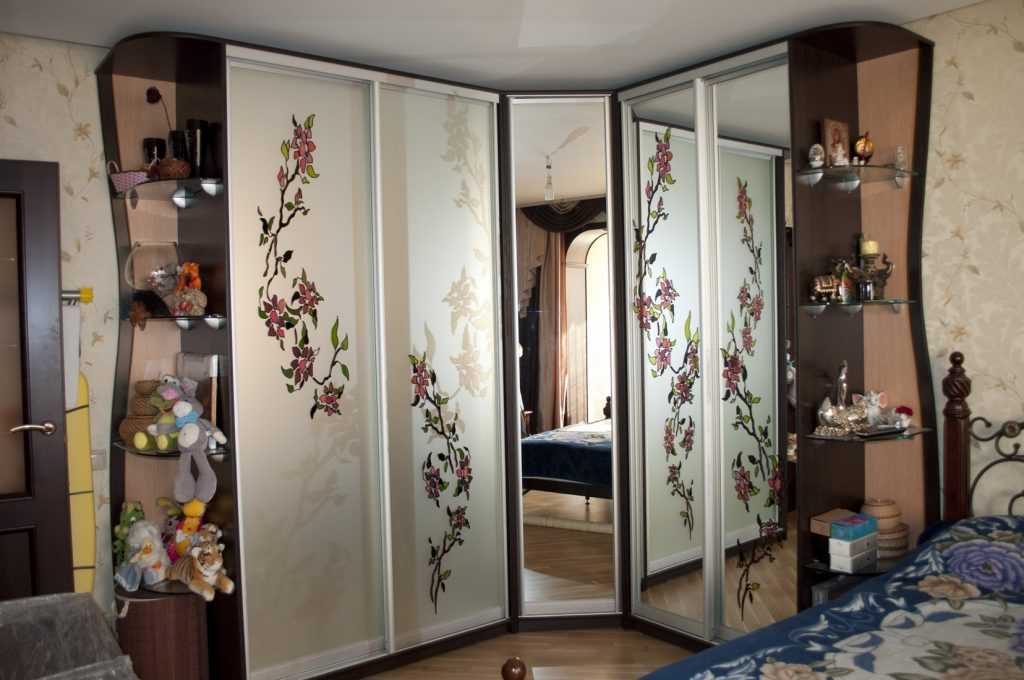 Фасад углового шкафа в спальне выполняется в нескольких вариантах: