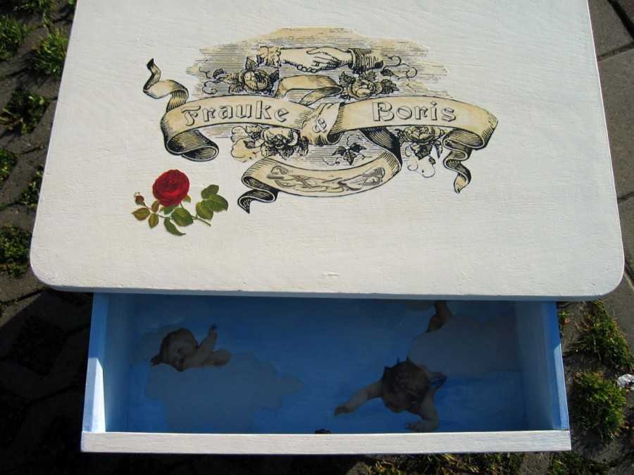 Подготовленную поверхность стола, будь то дерево или металл, нужно покрыть акриловой краской. После ее высыхания на столешницу прикладывают выбранное изображение, обильно наносят на него ПВА, немного разведенный с водой. Затем клей аккуратно распределяют по картинке при помощи мягкой кисточки, начиная от центра. В результате изображение приклеивается к столу. Картинками можно покрыть как отдельные части стола, так и мебель целиком. После полного просыхания столешницы ее покрывают акриловым лаком, а в случае, если нужна более надежная защита — яхтным.